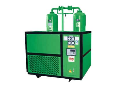 由壓縮機來的高溫高濕壓縮空氣,首先在換熱器中與干燥過的低溫 壓縮空氣進行熱交換,降低溫度,然后進入蒸發(fā)器被進一步降溫,在蒸發(fā)器中大部分氣態(tài)水分子冷凝成液態(tài)水被排出。此后含濕量很低的壓縮空氣進入吸附筒內(nèi)被進 一步干燥除濕,得到更低露點的成品氣,后面低溫的干燥壓縮空氣進入換熱器,冷卻高溫高濕的入口空氣,同時本身溫度也升高,防止了輸送的管路外結(jié)露,升溫后 的干燥壓縮空氣一小部分用作吸附劑的再生,提高再生效率,降低能耗。