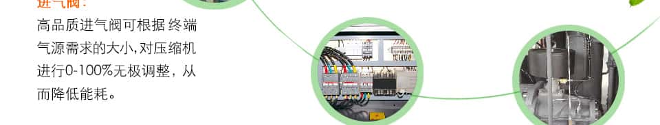 進(jìn)氣閥: 采用獨(dú)特的碟式進(jìn)氣閥,氣動(dòng)功能集約化,僅一個(gè)運(yùn)動(dòng)部件,可靠性高,無(wú)需日常維護(hù),并能隨著實(shí)際使用氣量的多少,對(duì)壓縮的氣量進(jìn)行0~~100%無(wú)級(jí)調(diào) 解,自動(dòng)的加載和卸載, 從而降低了能耗,進(jìn)氣閥內(nèi)設(shè)有單向閥,以防止突然停機(jī)時(shí),油和空氣回流。壓力損失小,工作壽命長(zhǎng),是目前更可靠,效率更高的進(jìn)氣調(diào)節(jié)方式。